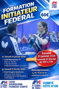 La formation « Initiateur Fédéral » du CD21 est la première étape de formation d’un entraîneur de tennis de table. Elle a pour objectif de permettre aux participants (minimum « cadets ») d’avoir une première approche de l’animation d’une séance pongiste et de donner la capacité au stagiaire d’aider efficacement l’entraineur principal du club lors des entrainements. Cette formation est une première étape vers l’animation, qui se veut courte et simple, et qui peut donner envie par la suite de participer à la formation « Animateur Fédéral » organisée par la Ligue de Bourgogne-Franche Comté de Tennis de Table.