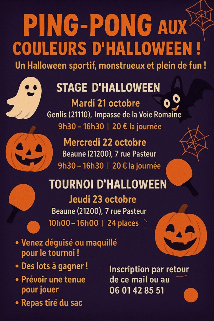 Stage et Tournoi Halloween Le Comité propose un stage ouvert à tous ainsi qu'un tournoi Halloween la première semaine des vacances de la Toussaint. N'hésitez pas à inscrire vos enfants